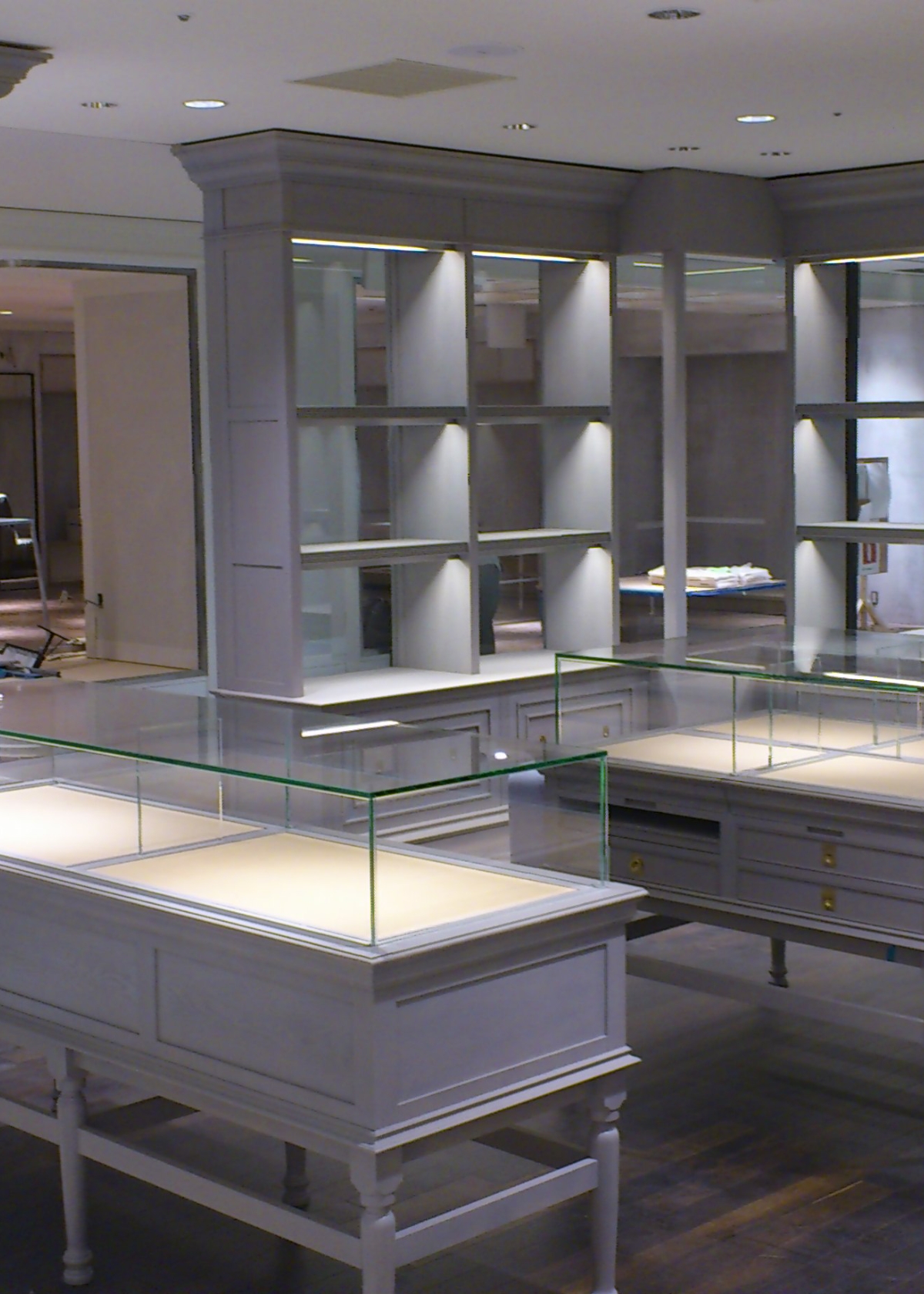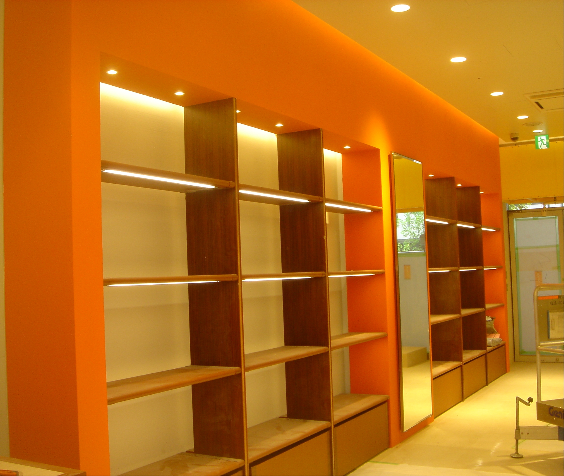 材料でいうと、住宅の施工ではありえないような耐久性の低い素材でも、どんどん使えます。材料による制約がないので、どんなデザインでも実現できるのが、内装施工の面白さの一つ。既製品にとらわれず、ディスプレイ用の棚も、木工所にオーダーメイドで作ってもらうこともありますよ!